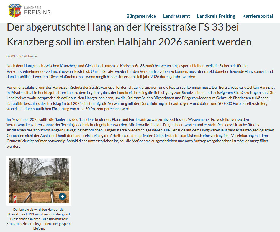 Zeige grösseres Bild Das Landratsamt Freising informiert bzgl. Vollsperrung der Kreisstraße FS 33 zwischen Kranzberg und Giesenbach Gemeinde Kranzberg2026-03-03T12:56:12+01:003. März 2026|Aktuelles| Über den Autor: Gemeinde Kranzberg Ähnliche Beiträge Straßenbauarbeiten und Vollsperrung in der Kreisstraße FS 6 in Leonhardsbuch Gallerie Straßenbauarbeiten und Vollsperrung in der Kreisstraße FS 6 in Leonhardsbuch Bekanntmachungen des abschließenden Ergebnisses der Wahl der ersten Bürgermeisterin und der Wahl des Gemeinderates Bekanntmachungen des abschließenden Ergebnisses der Wahl der ersten Bürgermeisterin und der Wahl des Gemeinderates Stichwahl der Landrätin oder des Landrats am Sonntag, 22.03.2026 Gallerie Stichwahl der Landrätin oder des Landrats am Sonntag, 22.03.2026 Briefwahl zur Kommunalwahl 2026 – Stichwahl – Landrat Gallerie Briefwahl zur Kommunalwahl 2026 – Stichwahl – Landrat